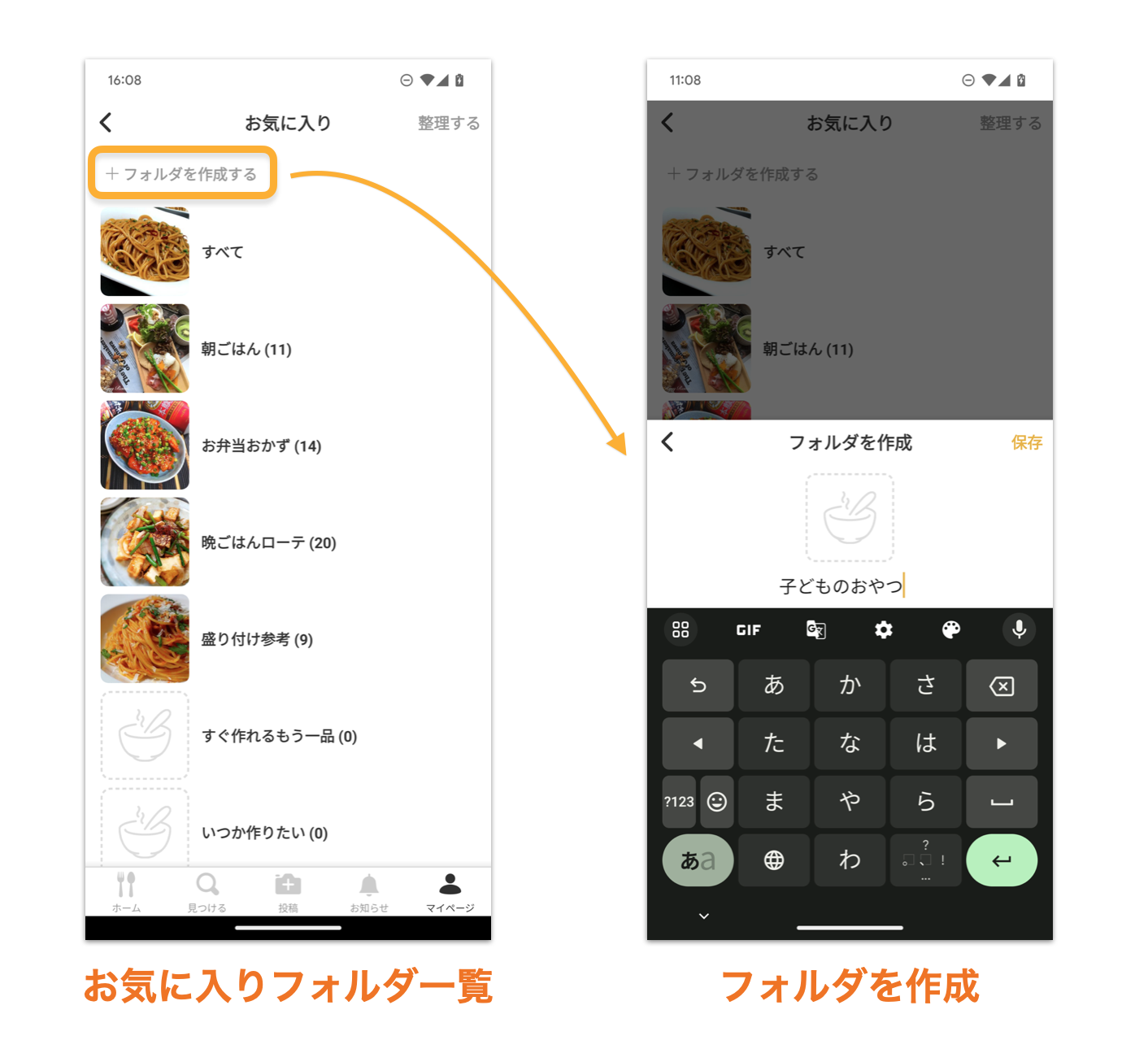 また、料理をお気に入りしたあと、その料理が入った新しいフォルダを直接作成することもできます。